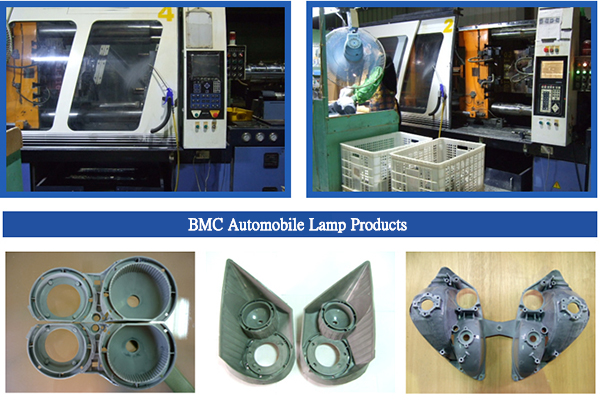 BMC is widely applied in varies industries, such as automobile lamp, electronic, or electric industry. BMC is suitable for compression molding or injecting, post-processing is unnecessary. The product's quality is stable, dimension is accurate, and the cost is relatively low."