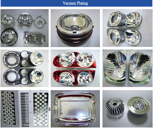 Vacuum plating has great optical character. Its deposition is quick and the coating is even. Except for large area, all kinds of material (BMC, PC, ABS, PEI, Aluminum, Megnalium) can be plated, thus, this technique is widely used in reflector processing. Various of automobile and reflectors, indoor and outdoor lighting systems, LED lightings, and even material beautifying, can this technique be applied.